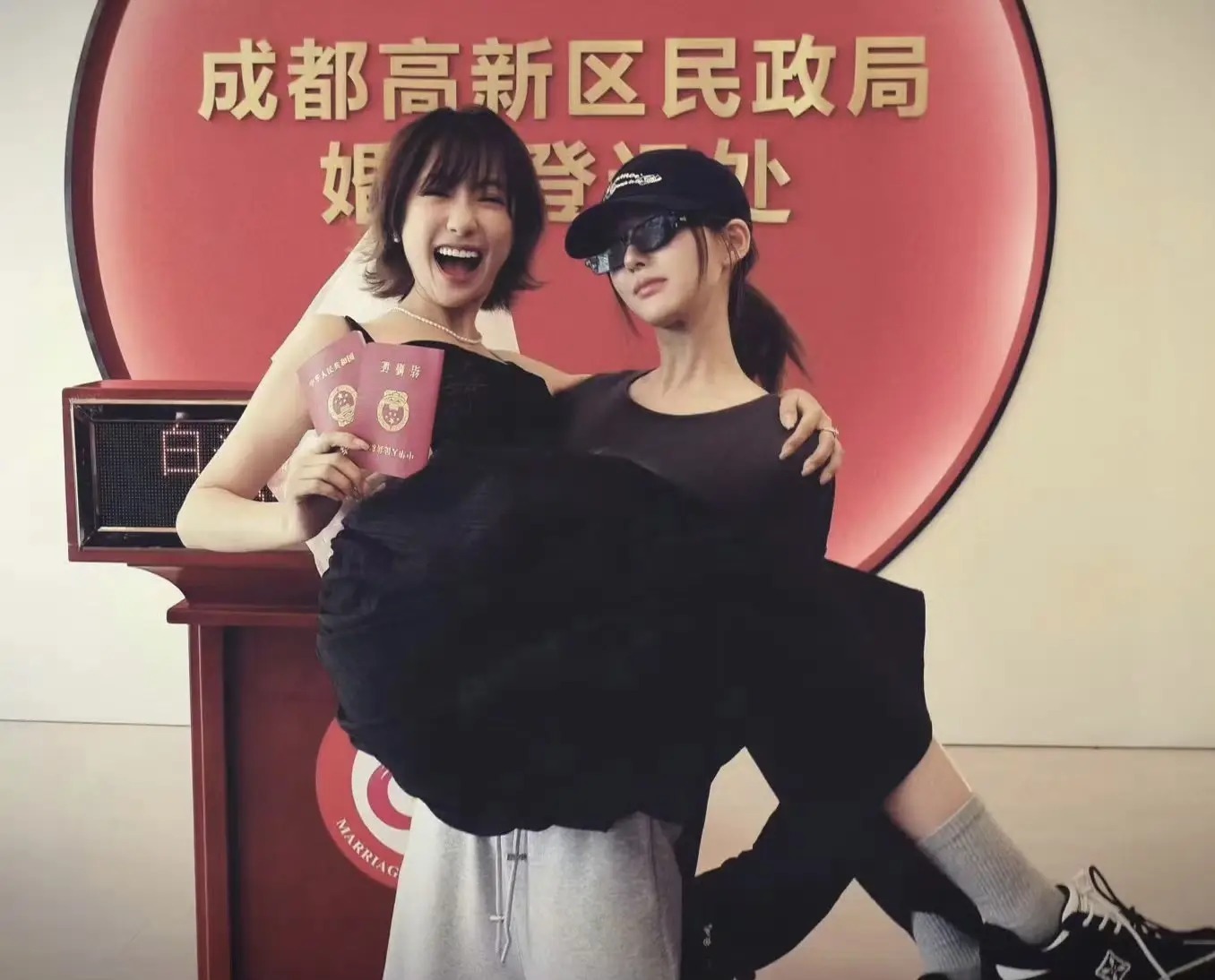 但整场婚礼的最强气氛组,必须是赵露思!作为魏笑的多年挚友,露思当天素颜便装,全程陪同,跑前跑后,比新娘还激动,被路人偶遇后,她还乖巧地戴上口罩,一点明星架子都没有,专心当好陪嫁姐妹,最绝的是,两人还举着结婚证拍起了合照,露思甚至直接上演公主抱,把新娘子抱起来转圈圈,这画面,比偶像剧还甜!网友们都笑疯了:“别人领证是老公陪,魏笑领证是顶流闺蜜陪,这排面,没谁了!”